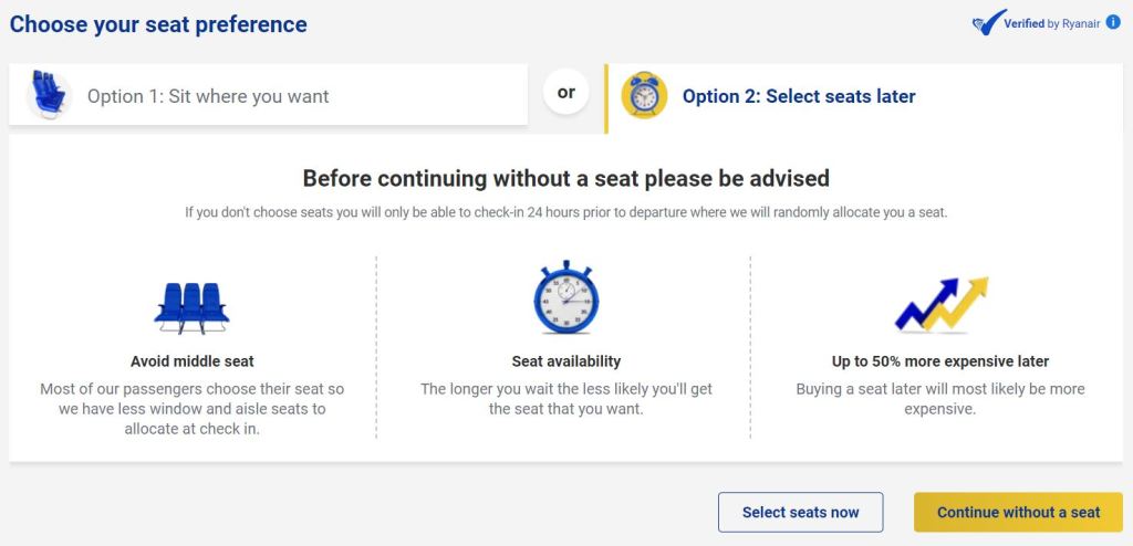 Do Not Select A Seat: Firstly, when it comes to selecting a seat, don’t fall for Ryanair’s trick of choosing one at an extra cost. Instead, choose to be assigned a seat later. Ryanair is trying to get you to pay more, but if you wait until check-in, you may get a seat that was not taken during the reservation process. This can save you some money while still guaranteeing you a seat on your flight.